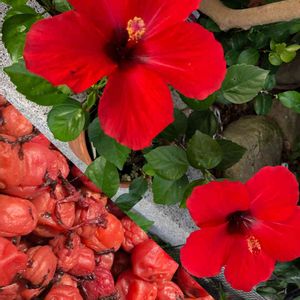 一週間雨は降らないらしい。 綺麗に咲いたハイビスカス🌺の おとなりで梅干しの土用干しをしています。 我ながら変な組み合わせで 💦💦💦
