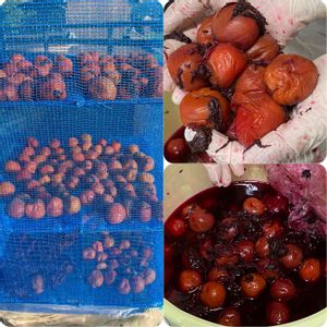 🟡初めての梅干し🟡 台風が来る前に干し終わりました❣️ いつもは梅酒、梅ジュースを作っていましたが、今年は友人の田舎の梅が豊作(梅の木6本で70kg)でしたので完熟した梅を2kg頂き試しで漬けてみました。 初めてにしては美味しくできたかな❣️