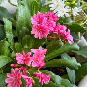 植木屋さんで「可愛い~」を連発している声が聞こえてきました 目をやると女子高生が「これもこれも」とレイウシアを何株か母親が持つ買い物籠に 親子が離れたあと見てみたらホントに可愛かったのでつい私も一株😅 リンドラ(スター)とシバザクラ、他の鉢で葉牡丹と寄せ植していたチェッカーベリーもお引っ越しさせて合わせてみました☺️ でも、レイウシアは育てやすさが「やや難」と後で図鑑で見てちょっとビビってます💦