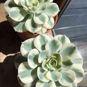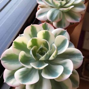 久々の投稿。゚(´つω・`。)゚。 この子はシルバークィーン錦ちゃん💕 色が青っぽくてとっても美しい子! まばらに緑の筋が入ってて斑入りが好きな人にはたまらない一品です笑 小さなお子様も2つ出てきてこれからが楽しみ🙌