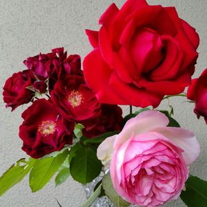 我が家のバラ三種 名前は知らない 右上のは大輪、先日の「今日のお花」でも登場。左のは📱待ち受け。右下のはどんな花だったのか忘れてたほど久しぶりに咲きました。 玄関に飾っています🎵 良い香り💕
