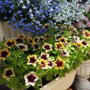 おはようございます✨ 育てるの苦手なペチュニアをポットのまま放置し続けて😂寄せ植えにしたのは6月上旬💦 やっと見頃になりました🤭 ペチュニアはナラフラセレクションズ(品種名はなかった)とヨコハマトワイライト🎶 ペチュニアに奮発したから後のリーフやトレニアは全部挿し芽で室内越冬した子達🤣ヒューケラだけ株分けしたものです🎶 beforeの植えた直後も載せます!