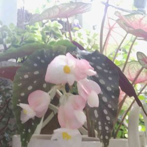 木立ベゴニアの月宮殿です。小さな挿し穂をいただいて挿した苗が咲きました♪ 花もキレイですが葉っぱの水玉模様も面白いです。
