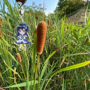 撮影場所:さくらの山公園 種名:コガマ 七海ロナさんのキーホルダーと撮影です。 ガマより穂が小さいです。雄花の後からしてヒメガマではないです。