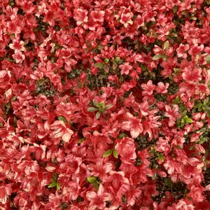 ウォーキング途中のマンションの生け垣に咲いている のとキリシマツツジ♡ ハッとするくらい 濃い赤色です❣️