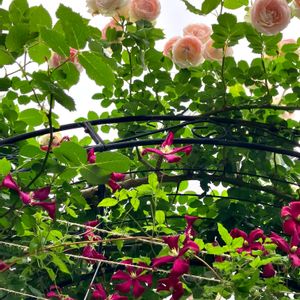 薔薇とクレマチス💕 これから雨なのでその前に🤳 ピエールはもう見納めっぽい😊 たくさんのつぼみ達もすべて開花し、さすがエネルギー不足なのか薄いピンクのお花になってマス😊 クレマチスマダムジュリアンコレボンは今花盛り😊 昨年はピエールのほうに絡まってしまったので今年は麻紐を張り誘引、来年はもう少しおしゃれにしよう😊