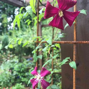 クレマチスに憧れて、ついに2種類手に入れて、育てていました。 小さな苗を買ったので、今年は花見れないのかな?と思ってたらスルスル伸びてついに花が!!☺️💓💓💓 って、あれ?小さっっ😳 もっと大きい花想像してた…笑 2種類買ったので、もう1種も楽しみ😊💕 そして、こんな急に蔓が伸びると予想してなくて、支柱が短すぎた😣 行き場の無い蔓が宙を舞う… 追記: よくよく調べたら、若い苗なので花が小さいみたい。 剪定をして、枝を分岐させた方が良さそうなので、ちょっと心配ですが、近いうちにやってみようと思います。