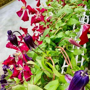 まだ頑張って咲いているクレマチスさんたち💕 新枝咲きの子たちはまだ2番花です。ドクターラッペルさんは何番とかなしにずっとポチポチ咲き続けてくれています🌸 昨日夕方台風対策の時に撮りました🤳 台風で痛んでしまうかもという思いで撮っておきました😂