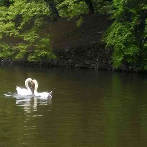 コブハクチョウの夫婦 ちょうど二羽の首が合わさってハート型になってます! 彦根城のイロハモミジに囲まれたお濠にて。