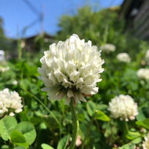 🪴草花たち その⑦ シロツメグサ(白詰草) アカツメクサと共に、 シロツメクサも咲いていました。 その向こうにはコメツブツメクサたち。 詰草たちで彩どり、華やかです💓 子供の頃、花の首飾りや花冠を作ったのを懐かしく思い出します。 ⌘ メモ ⌘ 🔸科名・属名 マメ科シャジクソウ属 🔸学名 Trifolium repens 🔸英名 White clover 🔸別名 シロクローバー 🔸原産地 ヨーロッパ 帰化植物(明治以降) 🔸花期 3月〜8月 🔸形態 匍匐茎および種子で殖える。 葉は卵形の3枚の小葉が付く(複葉)。 小葉の上面には斑紋がある。 時に4枚以上の小葉が付くことがあり、 「四つ葉のクローバー」として珍重される。 昼間は小葉を開き、夜間は閉じる(就眼運動)。 花は白色、またはわずかに桃色を帯びる。 10〜80個の蝶形花が集まって球状をつくる。 🔸近縁種 モモイロシロツメクサ(モモイロツメクサ) ムラサキツメクサ(アカツメクサ ) ベニバナツメクサ タチオランダゲンゲ ツメクサダマシ など。 🔸その他 江戸末期、オランダから長崎に輸入されたガラス器の 緩衝材として、乾燥したクローバーが詰められていた ことが切掛になり日本に渡来した。そこでクローバー 全体を「詰草」という。 明治以降には牧草として導入された。また、蜜源、 食用にもなる。 マメ科特有の根粒菌の作用により窒素を固定する為、 土壌を肥沃にする。