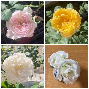 お疲れ様です♪ 強風に煽られながらHCにて薔薇巡り🌹 右下はバラ…ではなくブーケで貰った中にあったトルコキキョウ(笑) 花瓶の水を換える時にうっかり落としてしまったら花茎がポキッと😭 なのでまたミルクピッチャーに挿しました♪