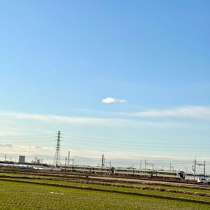 朝のウォーキングで見た風景☀️7時37分 日の出時刻 6時48分 1/6から朝ウォーキングを始めました🚶♀️ 麦畑と特急リバティ🚆