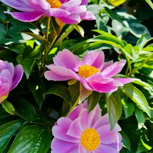 今年も咲いてくれた。 ピオニー サンセットという名前で売られていたのを引き取り手になり、かれこれ15年近くになります。 日があたるところに植えっぱなしです。 名前はサンセット🌇(日没、夕暮れの意味)ですが。 一枝に三輪は枝が耐えられず、…ほかの木の枝で支えてカメラ目線まで上げてます📸