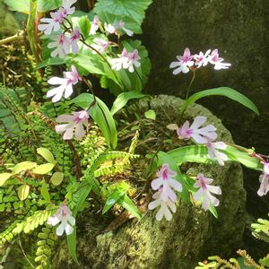 ランファンの皆様お待たせ致しました。 イワチドリです。 自然大好き派😘、兼園芸もやっています派です。このランは自然界では岩の割れ目などで見られる小さなランです。葉っぱは一枚でその上に小さな花を4〜6個咲かせます。花一つの大きさは約1cmです。この個体は五年ほど前に道の駅で購入したもので比較的容易に増えています。ただ、残念ながら自然界のものは見たことがありません。