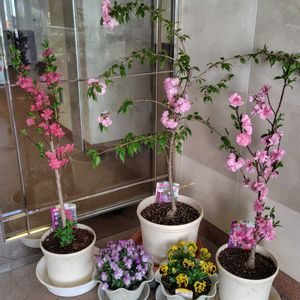 来週からエントランス工事 散ってしまう前にお花入れ替え 左から花桃赤、枝垂れ桜、花桃ピンク、見切り品のパンジービオラ