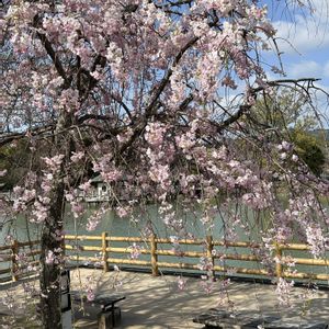 枝垂れ桜を見てきました。 曇り空が少し残念だけど 私は花より団子🌸🍡 枝垂れ桜を見ながら お抹茶と三色団子でのんびりです。