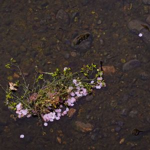 小川に散った桜のはなびら、、。流れてくるものを片っ端から撮ったうちの1枚です。なんか宙に浮いているようにもみえます。
