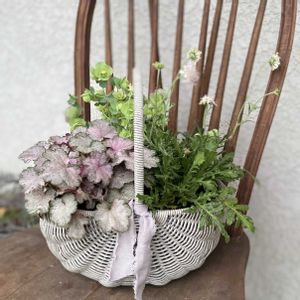 寄せ植え教室で作ったバスケット やっぱり素敵🩷 寂しいお庭の唯一目がいく場所です ベロニカ グレース ガーデンシクラメン ウエストリンギア スモーキーホワイト 葉牡丹 デュエット 宿根ネメシア