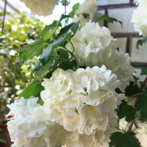 ビバーナム スノーボール✨ 我が家にやって来て何年目⁉️ きらまる亭出身の可愛い子💓 これからもっと白くなるね💓 地植えしたい気もするけれど、ブッシュになるのはイヤだな😂 ツルバラみたいに誘引出来たら面白いかも🎵