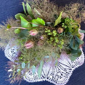 庭のスワッグ 「スワッグ教えて」と…友人が来ました 私も教わった事はないんだけれど… 庭の花を集めて初めて作った習作! 「わぁ!可愛い😍」「素敵💕」って連発の.年上超熟女 心は乙女だわ💕