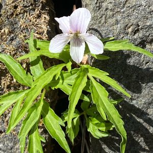 ナガバノタチツボスミレじゃないでしょうか⁉️ ・側弁基部は無毛 ・花柄は無毛←毛は少しあるように見えます ・根生葉はタチツボスミレの様な葉 ・茎葉は細長い三角形 茎葉は三角で長めですが、花柄に少し毛があるようなのでニオイタチツボスミレなのかなぁ🤔 ※やはりニオイタチツボスミレだそうです😀 hannaさんに教えていただきました🙇♀️