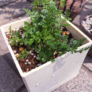 今迄お皿にのせて育てていたこれ、とても可愛いい小さい鉢があったので、ついに植えてみました。西洋シノブっていうのかな。シダ植物です。