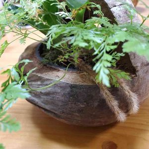 実家にプレゼントしたココナッツの鉢の寄せ植え まだまだ元気でした。 しっぽみたいなのがたくさん生えていてかわいい そのしっぽからもシダの葉が出ています。 西洋シノブとかラビットフットとか名前があるみたいです。