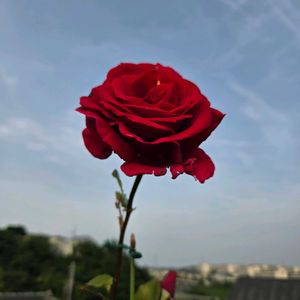 🌹薔薇 「ミスターリンカーン」 5月21日am5:56 ✧p📷qω•,,´)パシャ✧ 青空を仰ぐミスターリンカーンです。 あなたの胸のポケットに入れて下さい。🫶❤