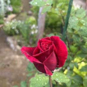 ミスターリンカーン ダマスクの強香 バラらしいしゅっと伸びたシュートの先に、凛とした花を着けている。