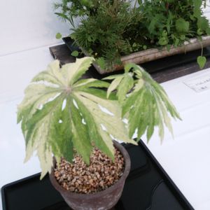 亀甲斑入りのヤブレガサと斑入りハンカイソウです。 ヤブレガサの方は遅くまで芸が暗まない良系です。