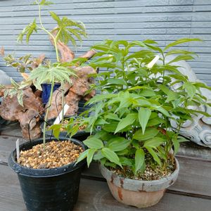盆栽市の戦利品 ヤブレガサ(左 中)とホウチャクソウ(右)