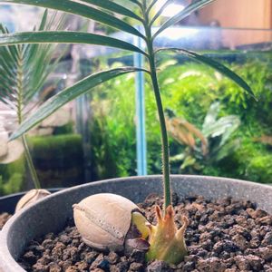 職場のソテツに実がなったので収穫。実から種を取り、育てること1年! こんなに大きくなりました🤗 根元がカッコいい😎