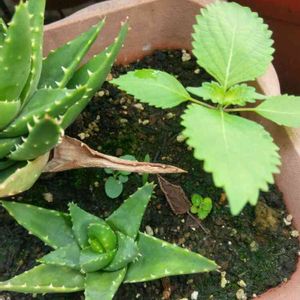 フヤジョウの鉢にどこからか種が来たのかシソが。 不思議な組み合わせ~✨ 大きくなったら頂こう🎵