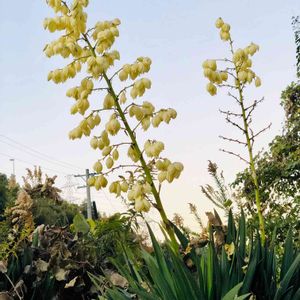 道路沿いに植えられたまま自活するユッカ🌴 冷え込んだ秋の空にユッカの花が元気にすっくとそびえてました☺️