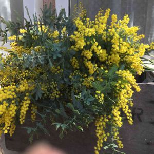 ミモザリース❣️ 前回作ったリース葉っぱを取り除いて お花だけで作ったら ドライになったらスッカスカに💦 昨日リベンジで 今回はユーカリの葉っぱを入れて モッリモリに作ってみました