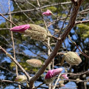 3/21 モフモフの蕾から、まさかのピンク💕 去年植栽に新たに植え付けられて、この冬、ずーっとモフモフの蕾になっていて、さてどうなるかと見続けていたのですが、今週、濃厚ピンクの花びらが出てきました‼️もぉ驚きました。こんなに鮮やかな色の花びらに出逢えるとは🥰 google先生によると、シデコブシ💓しかも準絶滅危惧(NT)に指定されている😳分布は、東海三県の丘陵地に限られてるって⁉️❓❓ いやいや待て待て。紫木蓮、シモクレン説もあるか🧐 どっちにしても数日後の開花がワクワクです💓 追🤗2日後には咲いてました。どうやらシデコブシ、ベニコブシです❣️