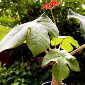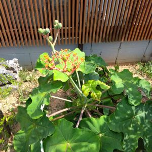 我が家のサンゴアブラギリだいぶ大きくなりました🥰 3人娘だったけど次女をお友達にお嫁に出して鉢の中が広くなったせいか急に大きくなりました💦 はじめのうちはかわいいまあるい葉っぱだったのが朝顔の葉みたいに3つにわかれ、今度はモミジみたいに5つに分かれてきてます 葉っぱの形がこんなに変わるなんて不思議😆✨ そして今朝‼️ 成長点になんかある‼️ オレンジのつぶつぶ🧡 もしや花芽かな😆💕💕 楽しみです♫
