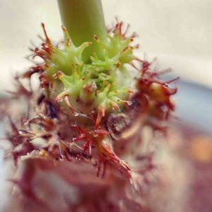一枚真っ先に葉っぱを伸ばしたあとはしばらく動きがなかったサンゴアブラギリさん。 こちらも簡易マクロレンズで観察してみたらムクムク始まってるようです! なんか形の違う芽は、もしかして花芽なのかしら。 うちに来て初めての初夏なのでわからないことばかり。