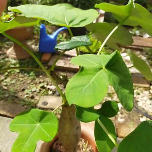 ヤトロファ・ポタグリカ😊 りんさん宅から嫁いで来て約3ヶ月ぐらい経ちました✨ 写真には写りきらなかったですが、大きい葉っぱも5枚ほどバン‼️と出てきて順調に育ってます☺️🌱 赤ちゃん葉っぱも可愛いし、ぷっくりしてきた幹?胴?もめちゃくちゃ可愛いです😆❤️ 赤い立派なお花が咲きますよーに☺️✨