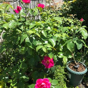 雨にも負けず、夏の暑さにも負けず、 冬の寒さにも負けず👏 鉢植えバラ、この場所は特等席✌️ テッポウムシ対策に金タワシを巻くと良いとの事なので、試して見ました😅