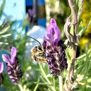 フレンチラベンダーの間を飛び交う ヒゲの長いハナバチさん。