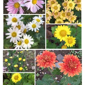 《今日のお花…スプレーギク》 今、実家の庭に咲いているスプレーギク達です🌼🌸☘️。 キクが好きな母や祖母・曽祖母のために昔プレゼントした苗が今でも元気に花を咲かせてます😊🎶。あと、6〜7種類ほど咲く予定です。 私も7種類ほど持ってます😊🎶。 名前がハッキリしているのは、左上の“シャトー風車”と、右上の“セザンヌ”です。 どちらとも、一度切り花用にカットしました✂️🌿✨。