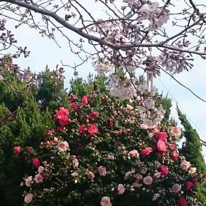 桜と椿のコラボレーション 始まりました🌸🌸 🌼🌼 真っ赤とマーブルの大きい椿のコラボも素敵です