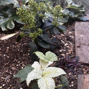 リビング前の日陰の庭 いつもは葉牡丹を隙間に入れるけど今年は欲しくなってしまったスキミアとカラーリーフのクリスマスローズをミツマタの足元に。ここで育ってくれたらいいな