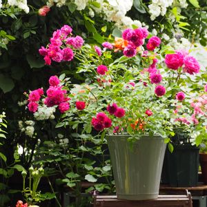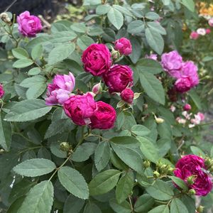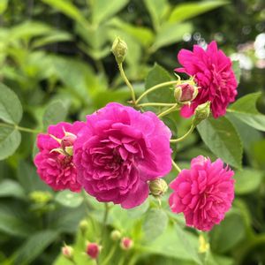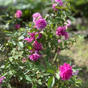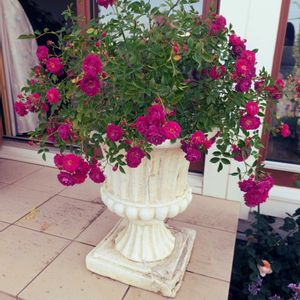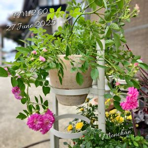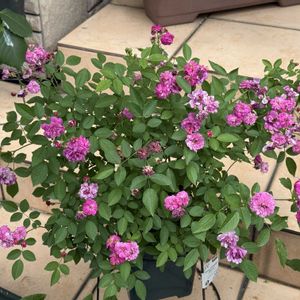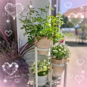 綺麗になろうね✨初めてのミニバラ♡ 昨年11月末にバラを育ててみたい♡気持ちをおさえきれずミニバラをお迎え♡ 初めての初夏を迎えました🤗 ①スイートチャリオット💖 12月の後、2回目の開花です♡ なぜ?こんなに伸びるの?GSのバラ名人に聞き、調べ🔍 置場所をここに決めました✨ 陽当たり良好、風通し良し🤗 ②アップで! 🙇‍♀️シャッターの瞬間!風が強めにそよいで、形が歪んでます🍃 長~く細くしなる枝に😮‼しかも、頭を垂れているし(?_?)……徒長?萎れた?と初心者は汗🤭 全部特徴でした!💫 ハンギングさながらに、高い位置にセットし、枝垂れさせて全体の姿やポンポン咲きする房咲きのお花を楽しめたらなぁ~と🤗 ③6ヶ月前 12/1 幼(おさな)かわゆい🎀🐥花も咲き驚きと感動✨🥹とても良い株で届きました ④クリームピンク ロスアロマ こちらは初開花🩷アンティークで絶妙なピンクのお花を見せてくれました🩷🥹感動✨ コンパクトにまとまりつつも、しっかりして来ました💪😊 蕾があって何個咲くのか楽しみでなりません😆 ⑤6ヶ月前 12/1 この子は寒さに耐えるべくなのか、きゅっとして超コンパクトな姿で。葉や茎がしっかりしていて良い株を届けて頂きました😊 ✨手間ひまをかけた分綺麗になれる✨ このバラ名人🌹✨の言葉を胸に、お手入れを心がけました🧤 花後カット✂や肥料に消毒、混んだところの葉をカット✂など😊 名人の言葉🌹✨?!なんかエステサロンのキャッチコピーみたいな😆 スイートチャリオットさん💖からは、小さくて細いくせに鋭いトゲでチクチクされながら😖細い枝や枯れ気味の葉を間違わないように切るのに一苦労😅💦 んもぅ~手の焼けるお嬢なんだから~♡ べた惚れの彼氏みたいwww🤭 綺麗でいてネ♡ 最近暑くて、暑さに弱い白クマ🐻‍❄️体質の私は、頭がうっすら痛い日々です😵💥 皆さんも、夜は涼しいパジャマや寝具でお休みくださいね😴🌃 お疲れさまでした🎐