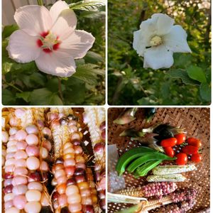 今日のお花🌸ムクゲ❀.*・゚ 🏷つぶつぶの日 🌈虹色トウモロコシ🌽 去年の種から再挑戦、お手入れ不足🐛虫が付き、上手く受粉されず、スカスカ🟡🟠🔵🟣⚫️🟤🌽コーンでした💦 実らないのはヤングコーンでいただきます😋 今朝の収穫🍅オクラ、ミョウガ 👘あおいちゃんと記念撮影📸