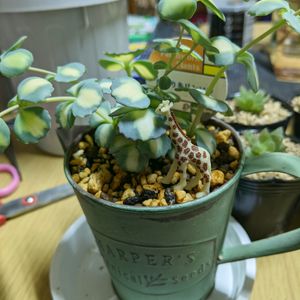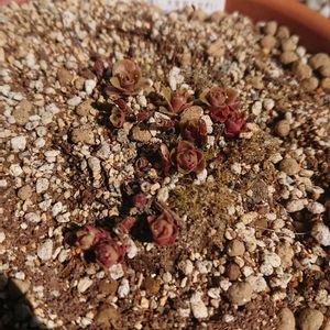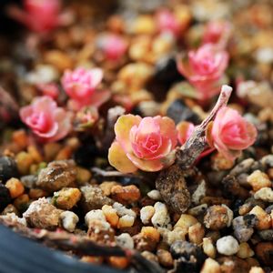 ★斑入りキリンソウ どーも♪ 一昨日、昨日と風が強かったせいで、 鉢から飛び出た苗をいくつか発見‼️ ゴッソリ抜けて三軒となりの鉢に飛んでたり、 用土だけがゴソっと減ってたり、頭傾いてたり💦 朝からあれやこれやを戻すことに…😔 雨は防げても風は防げないのがツライw 本日は斑入りキリンソウ♪ 1年の中で一番綺麗であろう 越冬芽からの春の芽吹きです😊 多肉の世界でキリンソウと言えば、 まずトリカラー(コーカサスキリンソウ)ですが、 日本の麒麟草だって実は負けてないんですよ🎶 (麒麟草は黄輪草とも書きますね) 葉の葉緑素が増えるまでの間?はこんな感じで、 透き通った葉に斑が入り幻想的な色をしています。 ね、可愛いでしょう?😆✨ わが国の多肉も捨てたもんじゃありません🤩 キリンソウは、 セダム kamtschaticum(カムチャティカム)として 紹介されていることがとても多いのですが、 カムチャティカムはエゾノキリンソウの種小名で 葉っぱの形も違う別種です。キリンソウの類は 現在セダム属からフェディムス属に変更されています。 ちなみに、 カタカナでセダム カムチャッカムと書かれたラベルで、 ホムセンや園芸店などで売られているものは、 キリンソウでもエゾノキリンソウでもありません😑 -∴-∵-∴-∵-∴-∵-∴-∵-∴-∵-∴- Phedimus aizoon var. floribundus Variegatus フェディムス アイゾーン 変種フロリブンドゥス 斑入り 和名 斑入り麒麟(黄輪)草(フイリキリンソウ) 別名 キジンソウ キジグサ シノニム Sedum aizoon var.floribundum Sedum aizoon var.aizoon