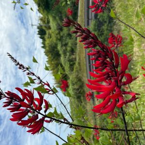 サンゴシトウ 今朝の実家近くの庭先にサンゴシト ウが満開しています。(*´-`)❣️ 夏に、総状花序を伸ばし紅い刀形で 細長い筒状花をつけます。アメリカ デイゴの旗弁が開かず筒状のまま花 を咲かせ多様な感じです。 アメリカデイゴとヘルバケアの人工 的な交配種です。