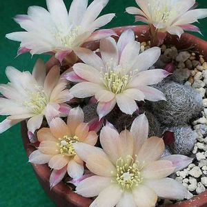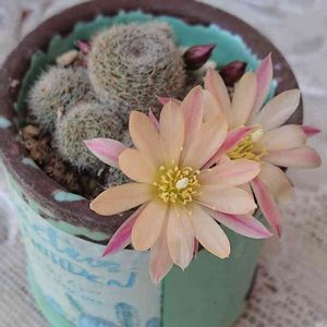 レブチア アルビオーサ? ダイソー出身♪ 隠れちゃってるけど、9個咲いてくれました🤗 まだ蕾があります。 地味目なサボテンだけど、お花はとっても可愛いです🌸😻