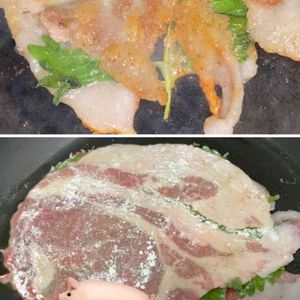 😋収穫した大葉で夕飯にしました❣ ️🐖豚肩ロースを薄〜く伸ばして塩胡椒・ガーリックパウダー→タコ焼き粉→カリカリに焼く❣️ご飯がすすむブ〜!🍚😄🐽